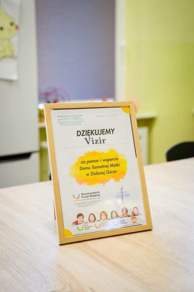 Z okazji ukończenia remontu przy wejściu do placówki na drzewie obrazującym wsparcie różnych podmiotów Stowarzyszeniu zawisł pomarańczowy liść z napisem „Vizir 2025” – symboliczne podziękowanie marce za przekazaną pomoc. Dzięki pomocy marki podopieczne Stowarzyszenia mogą cieszyć się odnowionymi wnętrzami: czystymi, jasnymi, wolnymi od wilgoci. Odnowione zostały sypialnie i jadalnia, pokój zabaw, powstało także nowe pomieszczenie – „pokój nauki”, gdzie oprócz komfortowego wnętrza dzieci moga korzystać z pomocy edukacyjnych. Dużym wyzwaniem była pralnia, która ze względu na intensywną eksploatację wymagała gruntownego remontu.