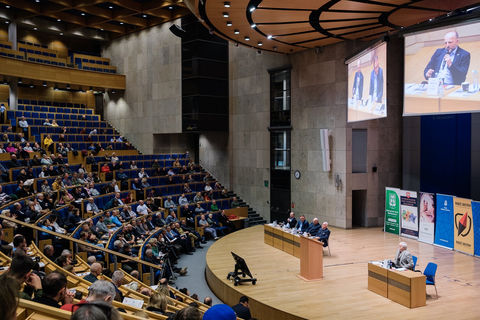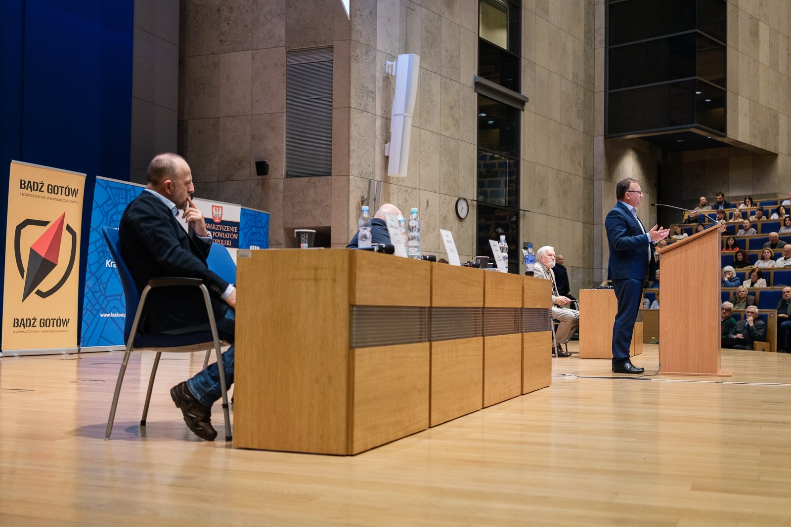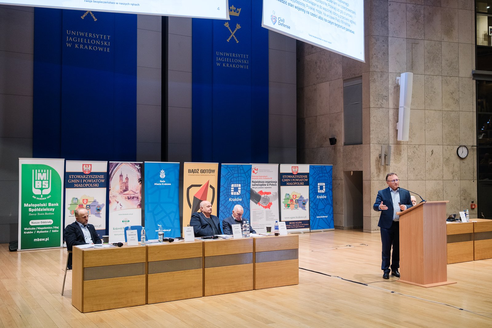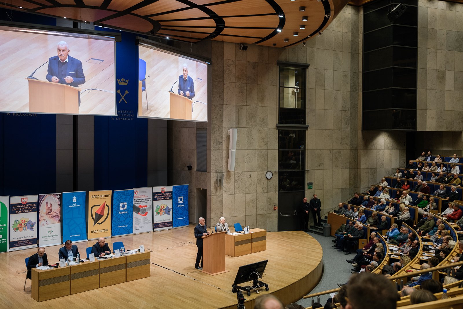 – To nasze ostatnie spotkanie w tym roku. Cieszymy się z wielkiej frekwencji, cieszymy się, że za każdym razem przychodzi około tysiąca osób, zainteresowanych bezpieczeństwem w miejscu swojego zamieszkania. Pod tym względem Kraków wyróżnia się na tle innych miast – mówił Kazimierz Barczyk, przewodniczący Stowarzyszenia Gmin i Powiatów Małopolski, rozpoczynając warsztaty. Podkreślał też rolę wójtów, burmistrzów i prezydentów miast, a także wojewody małopolskiego Krzysztofa Jana Klęczara w kształtowaniu obrony cywilnej.